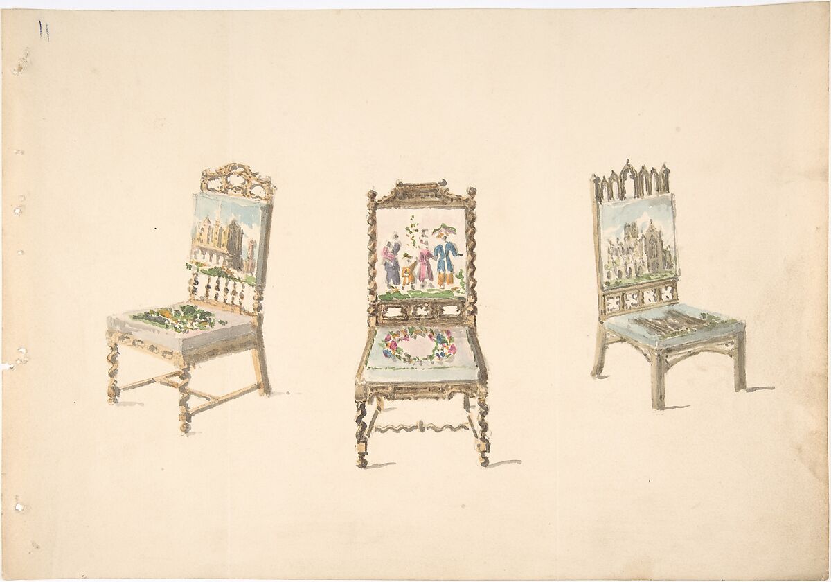 - Title:Design for Three Chairs with Pictorial Upholstery