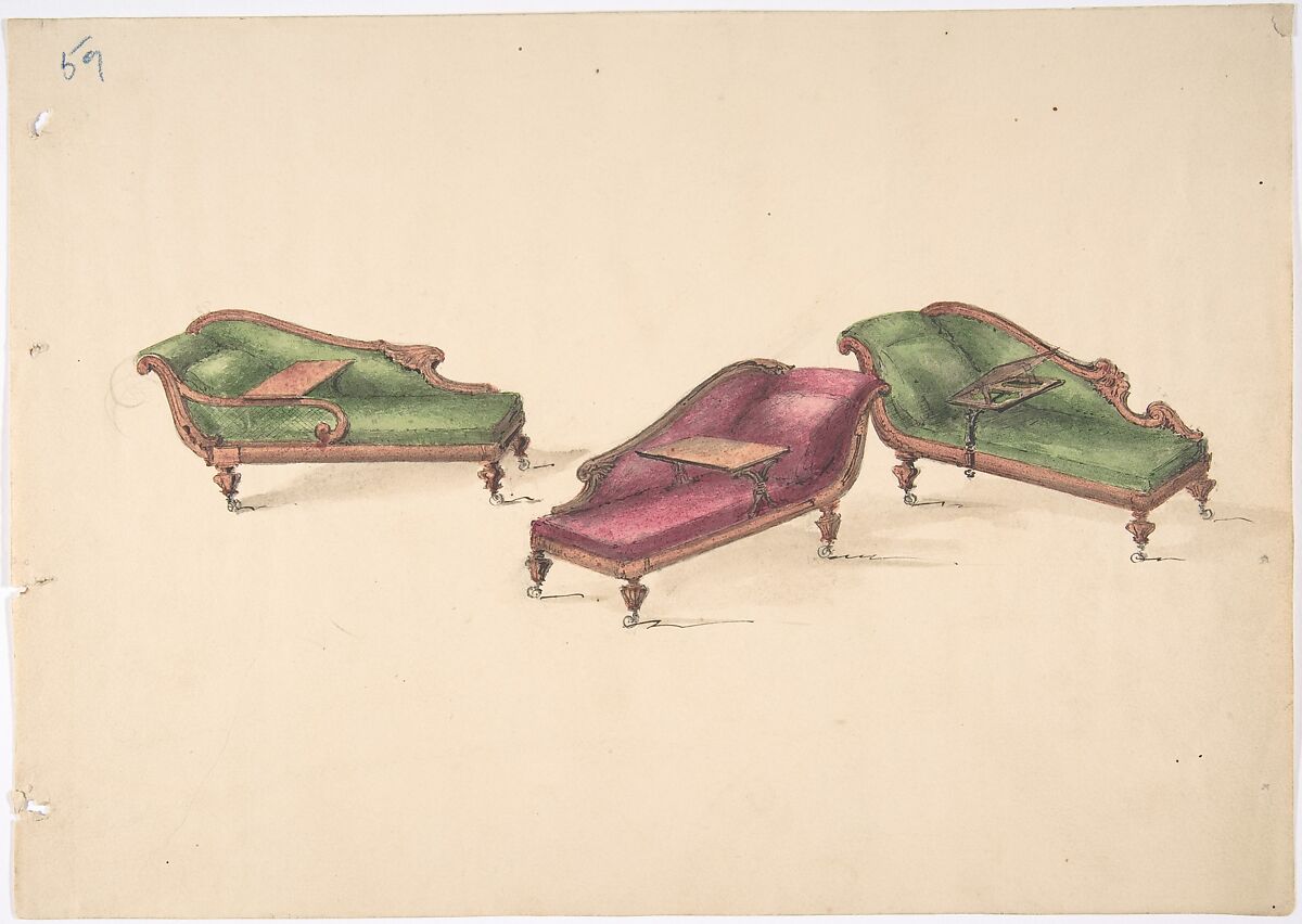- Title: Design for Three Reclined Reading Sofas with Trays, on Casters, Upholstered in Green and Red