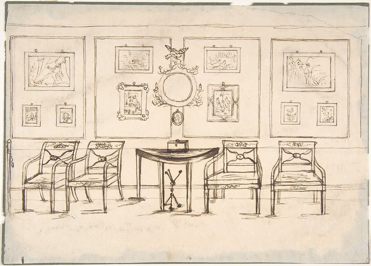 - Title: Interior with Four Armchairs, a Round Mirror, Demilune Table and Framed Prints or Drawings