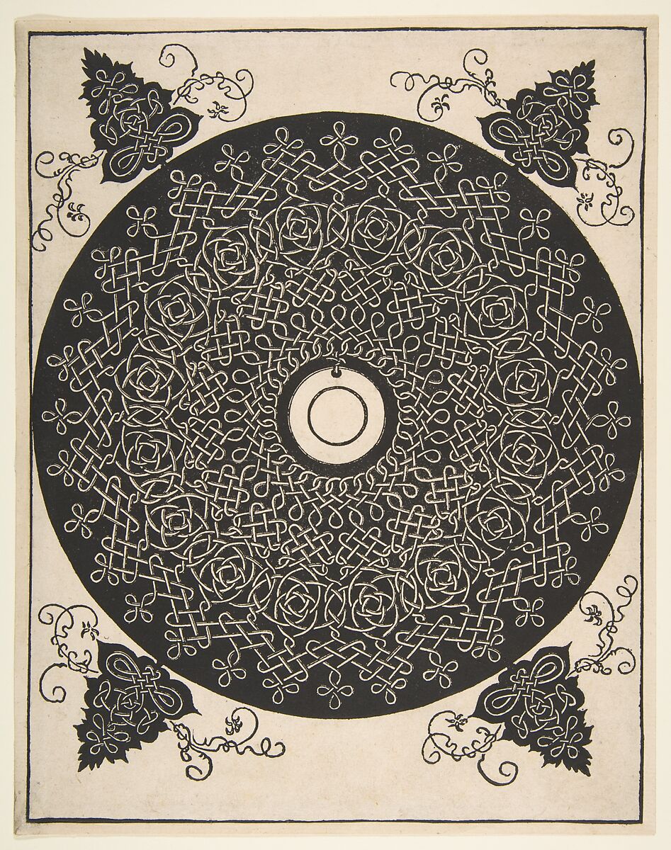 Embroidery pattern made up out of so-called knot work. The main pattern has a circular shape and is presented in white on a dark ground. The knotted ropes or straps are arranged in different patterns to form four tiers surrounding the central motif which is a blank, circular medaillon. On the four outer corners of the circle another, leaf-shaped ornament has been added which sticks out of the circle. The leaves are filled with more knot work in white on the dark ground while swirling straps in black surround them.
