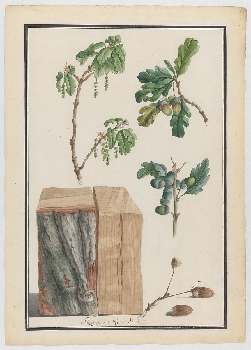 Studies of the blossoms, fruits and trunk of an English oak (Quercus robur)
