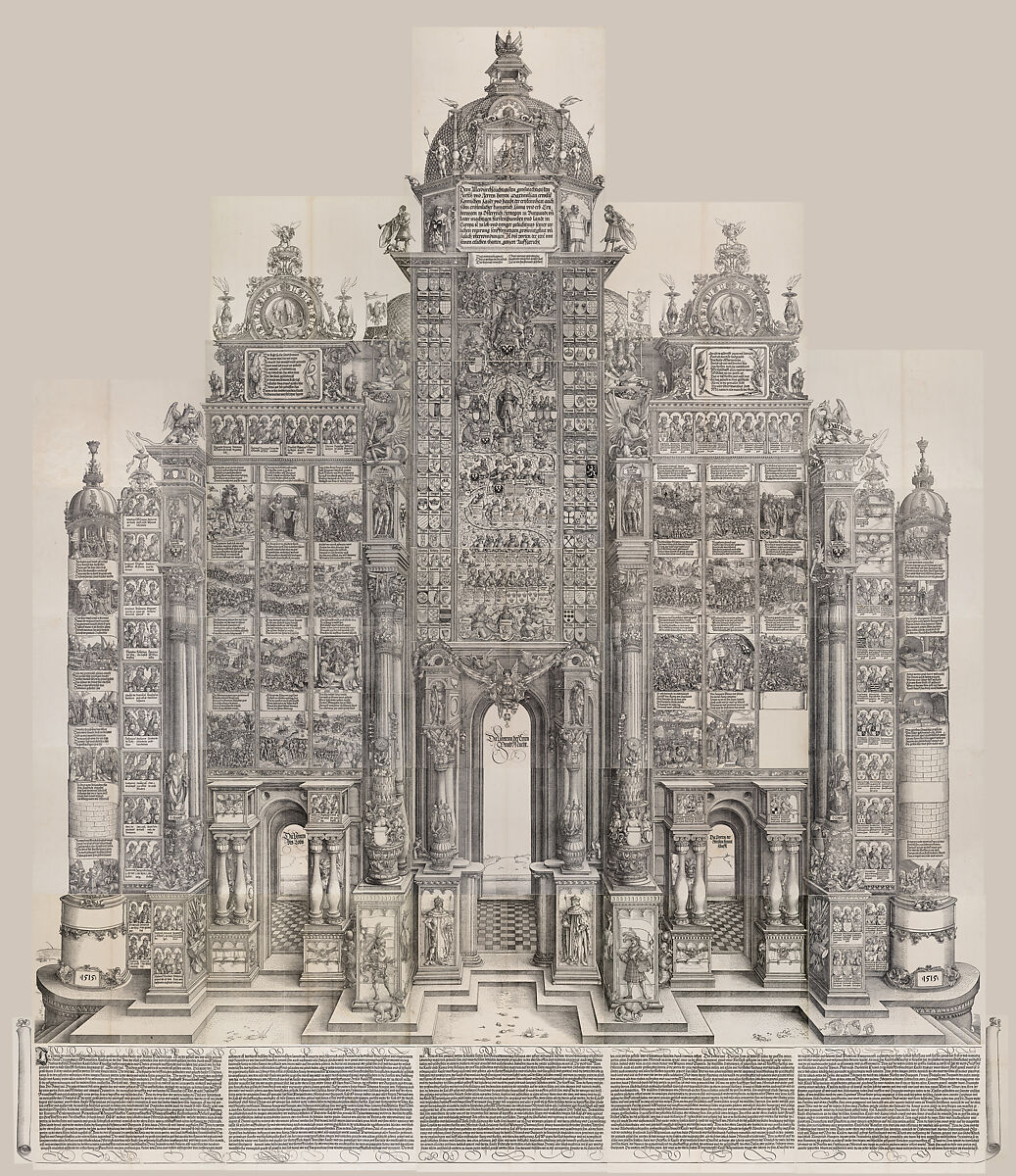 The Arch of Honor is the artistic summation of Emperor Maximilian I’s ambitions. Combining elements from many of his other commissions, it shows his ancestry, territories, extended kinship, predecessors as emperor, deeds, accomplishments, personal talents, and interests. Among Maximilian’s many ambitious printed projects, the Arch of Honor is the only one that was completed and published during his lifetime. The full visual and textual monument comprises 36 sheets of large folio paper printed from 195 woodblocks