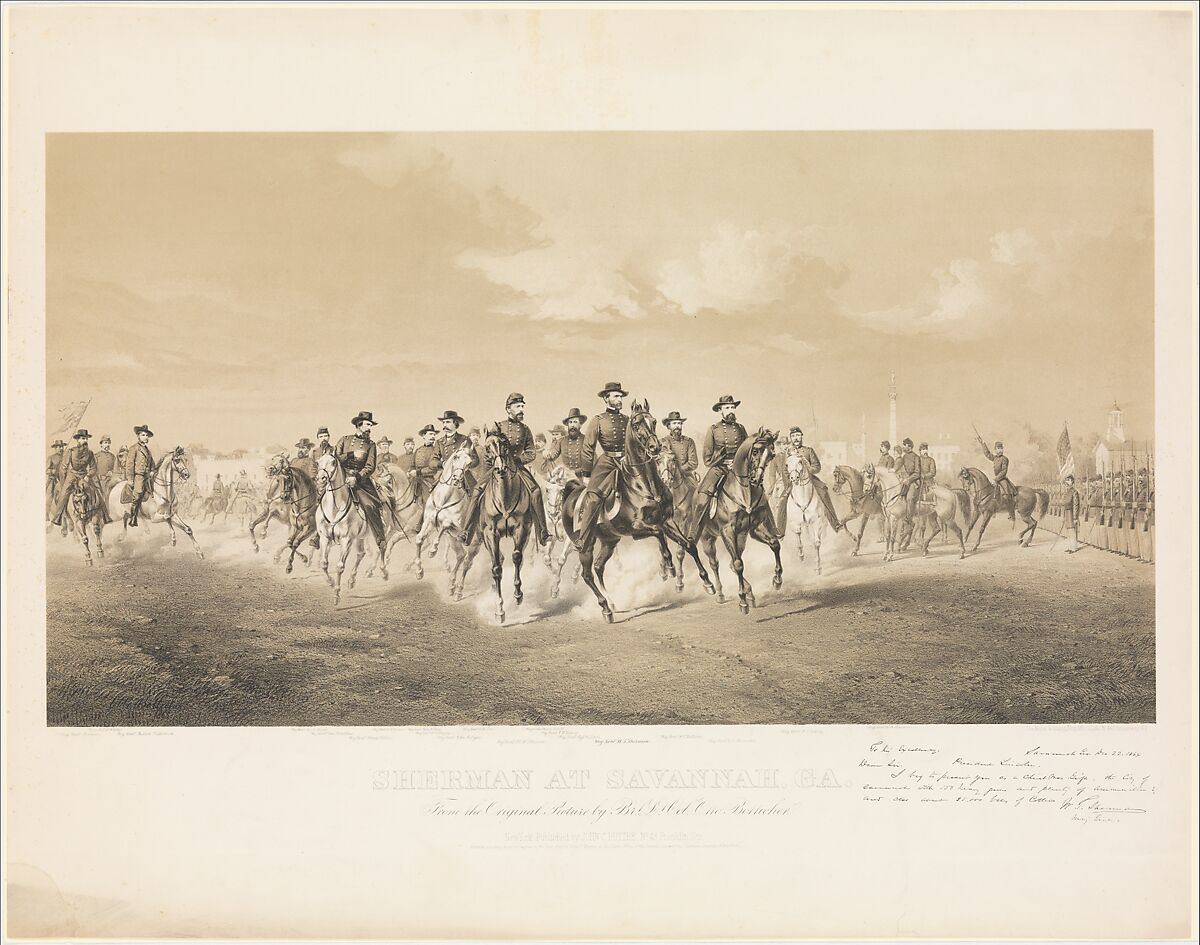 The general’s willingness to penetrate deep into Confederate territory without supporting supply lines proved to be devastatingly effective in undermining Confederate spirit and hastened the end of the war. At right additional officers review federal troops before Savannah, and below, Sherman’s famous letter presenting the city to Abraham Lincoln for Christmas is reproduced. The lithograph is based on a painting by Botticher who left Germany in 1848, established a portrait and lithography studio in New York, served as a lieutenant colonel in the Union army, and became known for the accuracy of his military subjects.