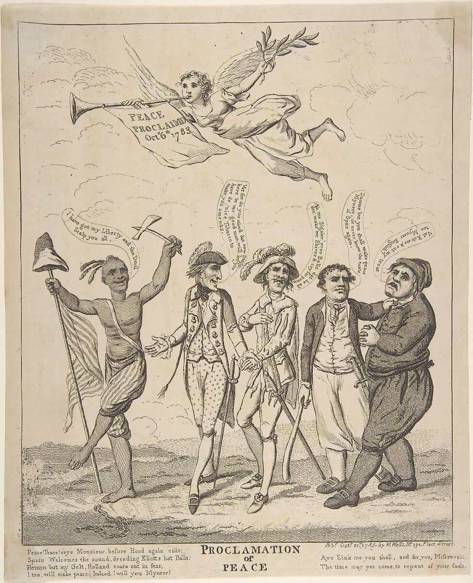 This printed satire responds to treaties that marked the end of the Revolutionary War. Even though fighting came to an end in North America in 1781, it took three more years to negotiate the related international settlement. An official proclamation of peace was made in Britain on October 6, 1783, recorded here on a banner that hangs from the trumpet blown by a winged representation of Peace. Male figures below embody the former combatants–America, France, Spain, Britain and Holland each of whom comments on the situation. Britain would not reach a settlement with Holland until 1784. Two successful British military leaders, Samuel Hood and George Augustus Eliott, are mentioned in the verse in the lower margin. America is characterized as "Miss revolt" who "may yet come to repent of [her] fault."