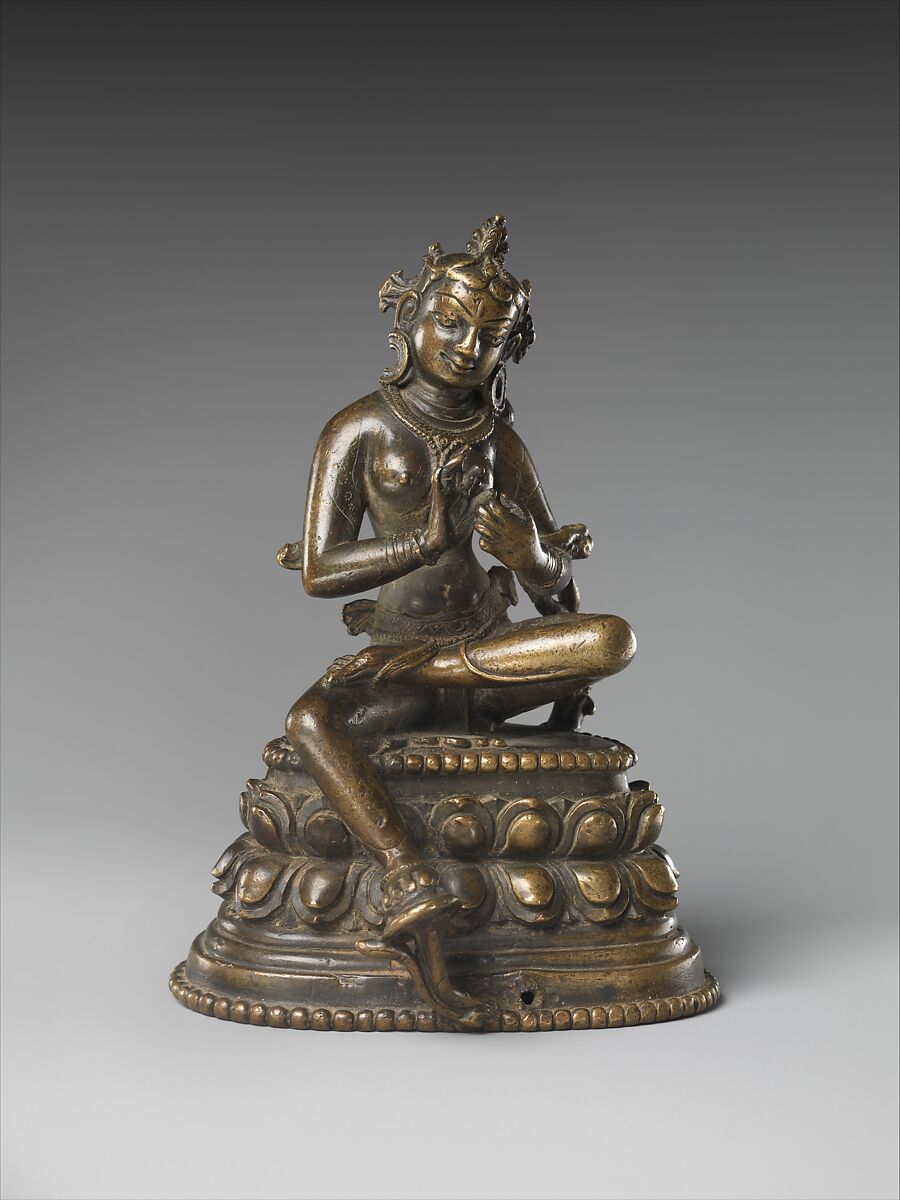 This female bodhisattva holds her hands in dharmachakramudra (gesture of exposition). The stem of a flower would have supported her identifying attribute, now lost. She is likely Prajnaparamita, the wisdom goddess, whose identifier is a manuscript.
