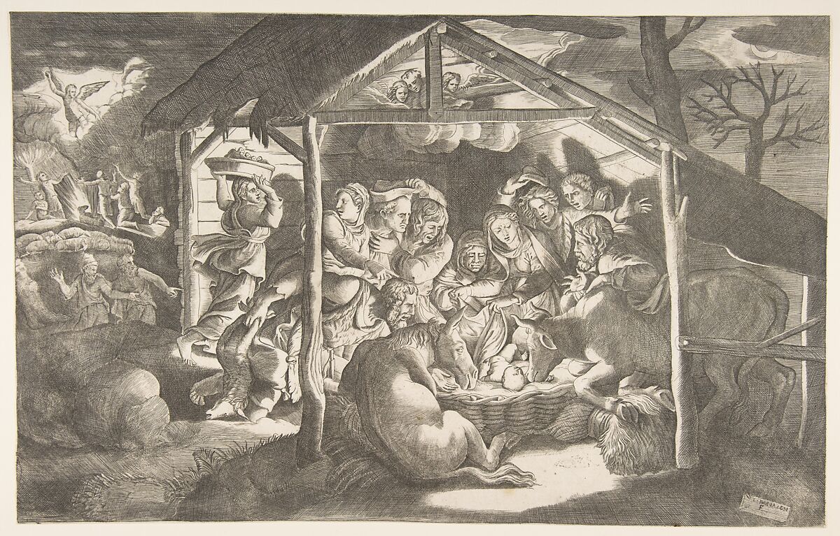 - Title: The adoration of the shepherds, various figures at night surround the Christ Child