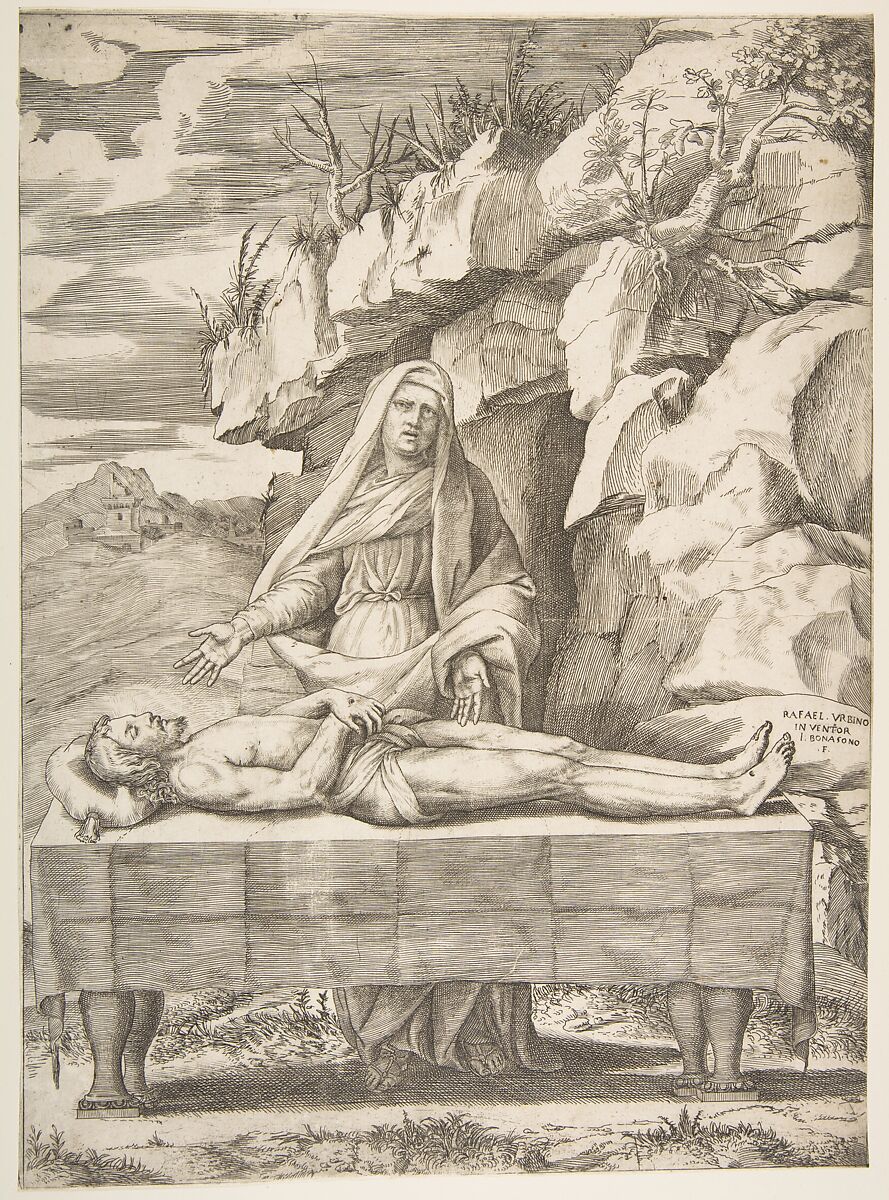- Title: Pietà, Christ stretched out on a table in a landscape, the Virgin standing behind arms open
