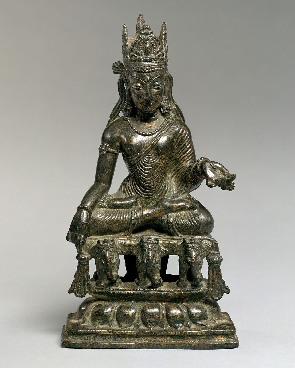 Akshobhya is one of the five Transcendent Buddhas of Esoteric Buddhism. He sits on a tasseled throne supported by three crowned elephants, his traditional mounts.
