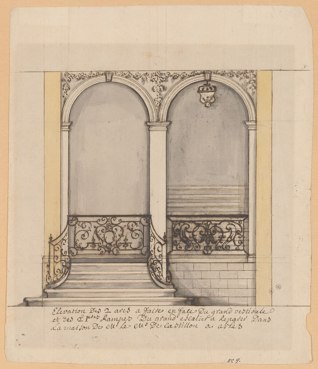 - Title: Elevation for a stairway and a second en suite drawing (unmatted): design for ironwork balustrade