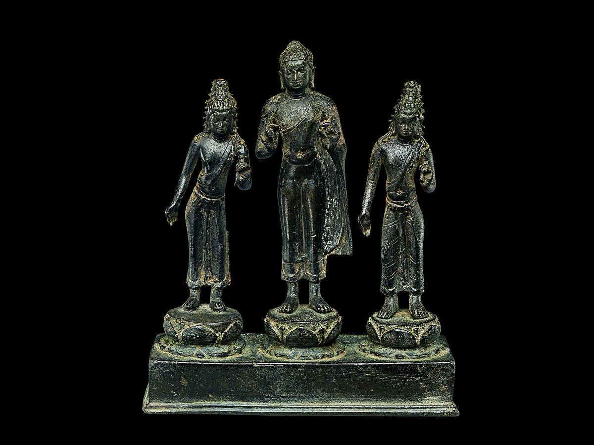 The iconographic configuration in this Buddhist triad was favored in the Mon territories of Thailand and widely propagated in the Srivijayan regions of peninsular Thailand and Sumatra. This triad with a central Buddha flanked by Avalokiteshvara and Maitreya identified by their crown insignias—the Amitabha Buddha and a stupa, respectively—came to be of paramount importance in early ninth-century central Java. Several major temples were built under royal patronage with these ensembles (albeit with all the figures seated) as their principal cult images, those at Candi Plaosan Lor and Candi Mendut being the best preserved.