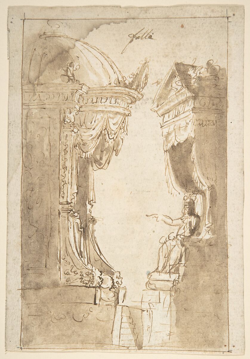 - Title: Design for a Stage Set with Two Thrones (recto); Landscape (verso)