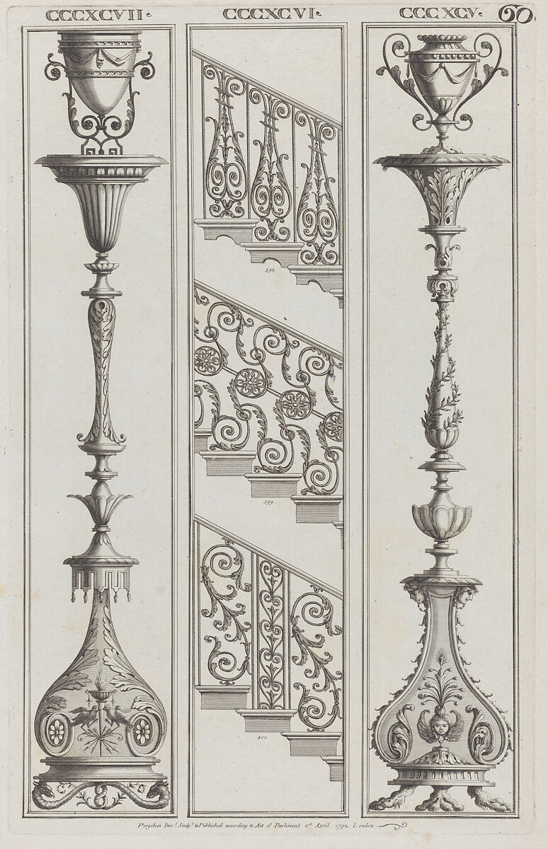 These designs for candelabra and ornamental railings are numbered CCCXCV to CCCXCVII and 398 to 400. The print comes from a group created and published serially in London by Pergolesi between 1777 and 1792. There is no title page, but a prospectus of ca. 1786 described the group as: "A great variety of original designs of vases, figures, medallions, friezes, pilasters, panels and other ornaments, in the Etruscan and grotesque style." The complete set contains 67 plates numbered 1-66 (two are numbered 56), with designs within the plates irregularly numbered 1-435 (in Roman numerals at first, with Arabic numbers later introduced). In 1801, after Pergolesi's death, four additional plates of designs were published by a bookseller Dulouchamp (or Dulonchamp).