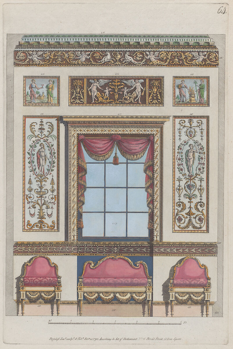 - Title:Interior Ornamented Wall with Window and Furniture, nos. 411–424, plate 64 from "Designs for Various Ornaments"