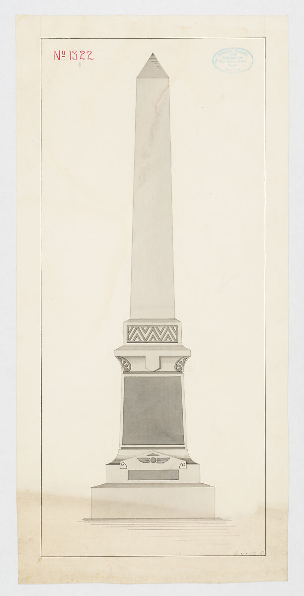 Alexander Maxwell designed and made grave monuments for New York area clients in the mid-nineteenth century (a fine example is a Butterfield family mausoleum of ca. 1875 at Woodlawn Cemetery in the Bronx). They likely were related to the marble and granite suppliers Alexander Maxwell & Co. of East Canaan, Connecticut, who provided marble for New York City Hall in 1838, and for a hundred columns used in an extension of the United States Capitol, Washington DC in 1860. This drawing comes from a group of designs for private memorials.