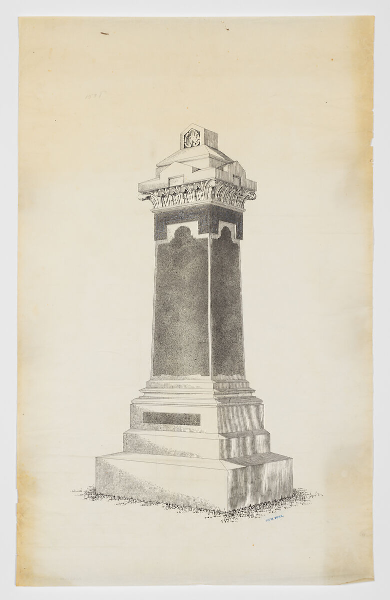 Alexander Maxwell designed and made grave monuments for New York area clients in the mid-nineteenth century (a fine example is a Butterfield family mausoleum of ca. 1875 at Woodlawn Cemetery in the Bronx). They likely were related to the marble and granite suppliers Alexander Maxwell & Co. of East Canaan, Connecticut, who provided marble for New York City Hall in 1838, and for a hundred columns used in an extension of the United States Capitol, Washington DC in 1860. This drawing comes from a group of designs for private memorials.