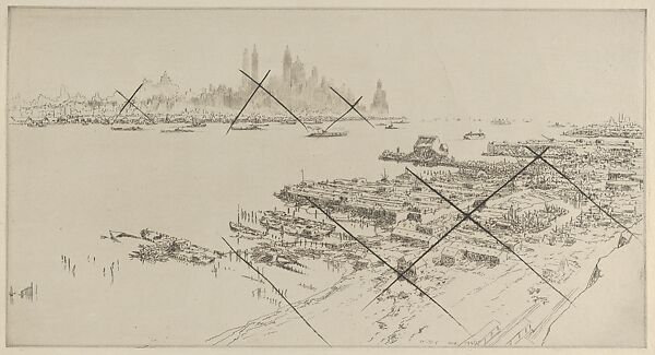 View of the island and skyline of Manhattan as seen from across the Hudson River from the town of Weehawken, NJ. The warehouses, wharves, and barges of the Weekhawken waterfront comprise the foreground.