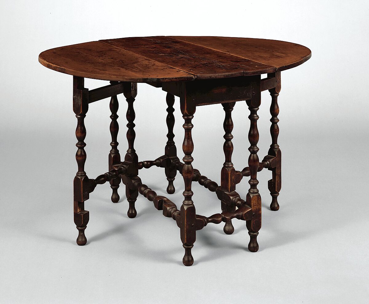 This oval table with falling leaves is trim and light in weight and ideally suited to a variety of functions in an early eighteenth-century interior. The design of its legs and stretchers with opposed ogee balusters centered on a ring, exemplifies the standard turned vocabulary characteristic of William and Mary-style Boston and Boston-inspired tables of this form.