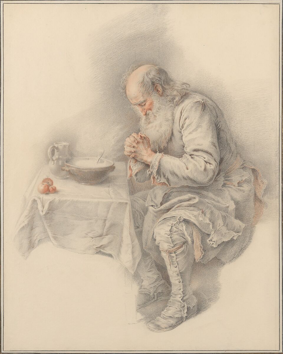 A painter and draftsman, Portail was given the title Dessinateur du Roi in 1738 and by 1740 held numerous positions at the French court at Versailles. In 1746 he was made a member of the Académie royale as a still-life painter, although today he is best known for his meticulous and observant chalk drawings. The old man who modelled for the Met's drawing appears in many works by Portail, sometimes as a saint and other times as a genre figure, as here. The perfect state of preservation of this drawing allows one to appreciate Portail’s detailed, almost trompe-l’oeil, technique. From the steaming bowl of porridge, to the folds in the tablecloth, to the old man’s frayed clothing, all is rendered in a highly tactile manner. Portail was particularly favored by the royal mistress, Madame de Pompadour, who owned this drawing.