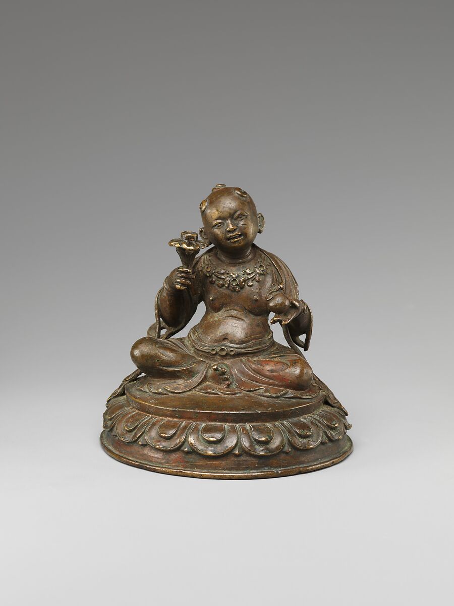 This work was likely produced for Chinese use. This unusual representation of Manjushri shows him as a child, with a plump face and the five topknots of childhood, known in China as wuji wenshu. A foliate necklace with settings for gemstones adorns his youthful figure.