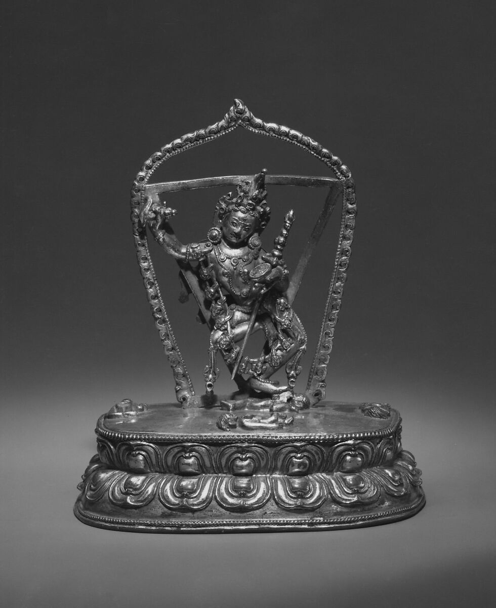 Vajravarahi, a major deity in the Vajrayana tradition, witnesses the merging of Hindu iconography in the expanded Buddhist pantheon. This wrathful goddess has evolved from Varahi, one of the fearsome seven mother goddess of Hinduism, the Matrikas. Here she has lost the projecting boar head of earlier versions that linked her with Vishnu’s boar avatar Varaha.