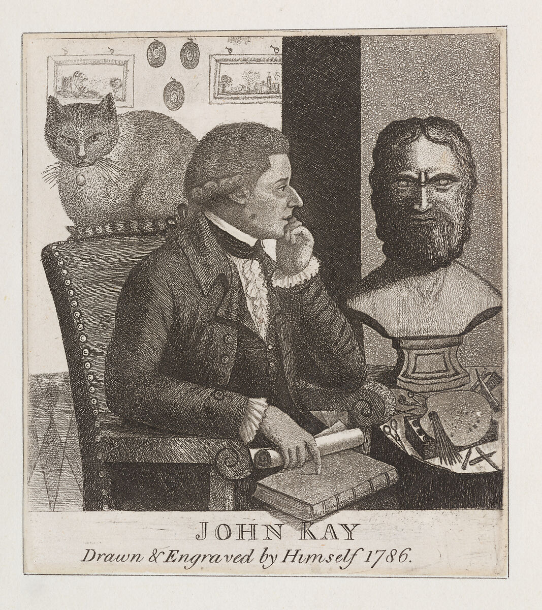 Kay portrays himself in profile, seated in an old armchair, holding a rolled paper and pointing to a book. A table at right supports a palette, paintbox and tools used by etchers and barbers. Above these, a scowling classical bust asserts the high demands of art and philosophy. Kay's contemplative pose, gesture, and the prominence given to the bust, together communicate his admiration for the ideals of the Scottish Enlightenment–many of whose participants Kay had, or soon would, portray. More whimsically, the fixed gaze of a large cat on the back of his chair, echoes that of the philosopher to reminds us of Kay's humbler, often comical subjects. The scissors, comb and razor on the table point to his previous profession of barber–something he practiced until a bequest in 1785 freed him to become a full-time printmaker. Framed landscapes and portraits on a wall behind may represent early efforts at etching.