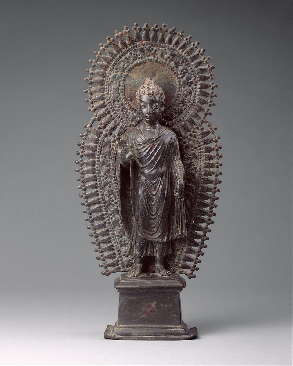 A few small personal images from Gandhara representing the Buddha have survived. This metal image blends elements seen in the stone sculpture of Gandhara with the Gupta style of north India. Its portability made it an important vehicle for disseminating the Gandharan style to other parts of Asia.