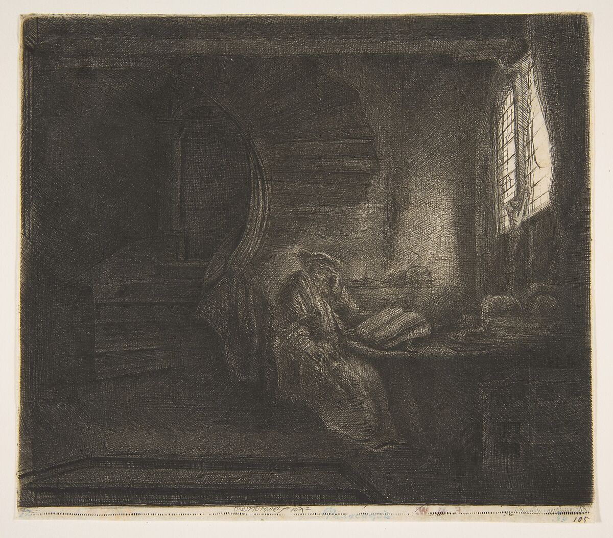 Small details that allude to the identity of the subject, such as the skull and cardinal hat on the wall behind him are barely legible within the intricate net of lines. Jerome’s lion companion, which is visible beneath the desk in some impressions of this image ( see NGA 1994.60.52), disappears completely here. The half-illuminated crucifix leaning against the windowpanes suggests that the light streaming into the room is a divine radiance, offering another clue that the figure we see is a saint in the midst of spiritual work. At the same time, Jerome’s relative ambiguity in this print would have allowed for a 17th-century audience to identify with him. St. Jerome holds a pen in one hand while he props up his head with the other, conveying the exhaustion caused by his mentally straining work. In Rembrandt’s closely related portrayal of a student by candlelight (66.521.17), the subject also rests his head in his hand while studying at a dimly lit desk. Together these two prints draw a parallel between historical and religious intellectuals and contemporary scholars.