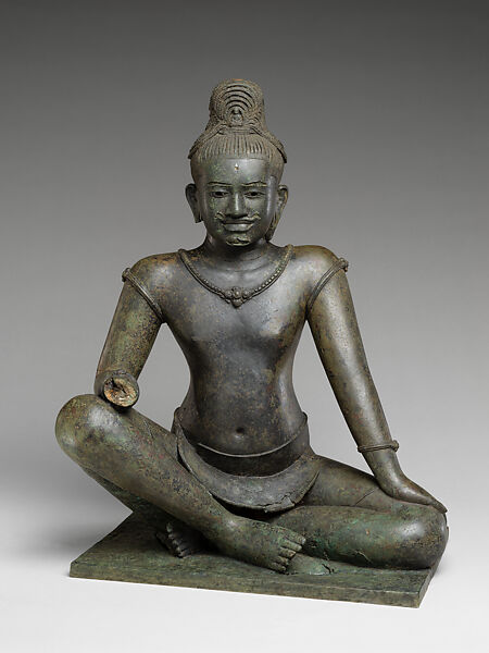 This artwork was restituted in December 2023. It is no longer in the museum’s collection.The Buddhist embodiment of infinite compassion, the Bodhisattva Avalokiteshvara is rarely represented in the rajalilasana seated posture, which is more associated with rulers and Hindu gods. Monumental metal sculpture represents the apogee of Khmer artistic production, and this is one of few large-scale images from the Angkor period to have survived intact. In Khmer royal cult practices, a close identification between a ruler and his chosen deity was customary; thus this figure, so unusually seated in a king-like posture, may have been intended to serve as both a representation of the bodhisattva and a portrait of the ruler-patron for whom it was commissioned. If not for the representation of the Amitabha Buddha, the spiritual mentor of Avalokiteshvara, in the elaborately coiffured chignon, this realistic image could be mistaken for a secular portrait.