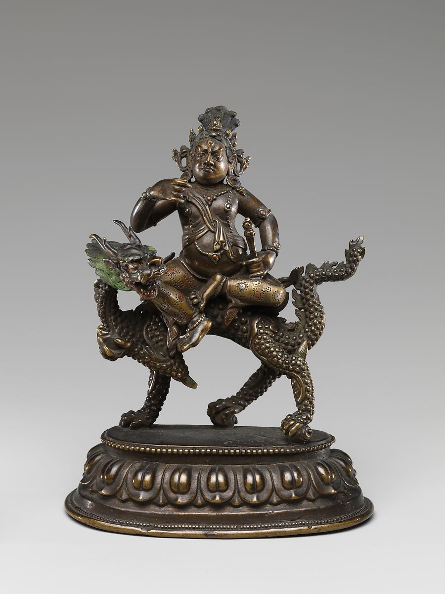 Although part of the jewel-born family associated with the Buddha Ratnasambhava, white Jambhala is said to have been born from the right eye of the compassionate bodhisattva Avalokiteshvara. He is identifiable by the dragon he rides and his gold sword, a variant of the khatvanga ritual staff, which he holds in his left hand. He alleviates suffering from poverty and sickness and purifies nonvirtuous karmic actions.