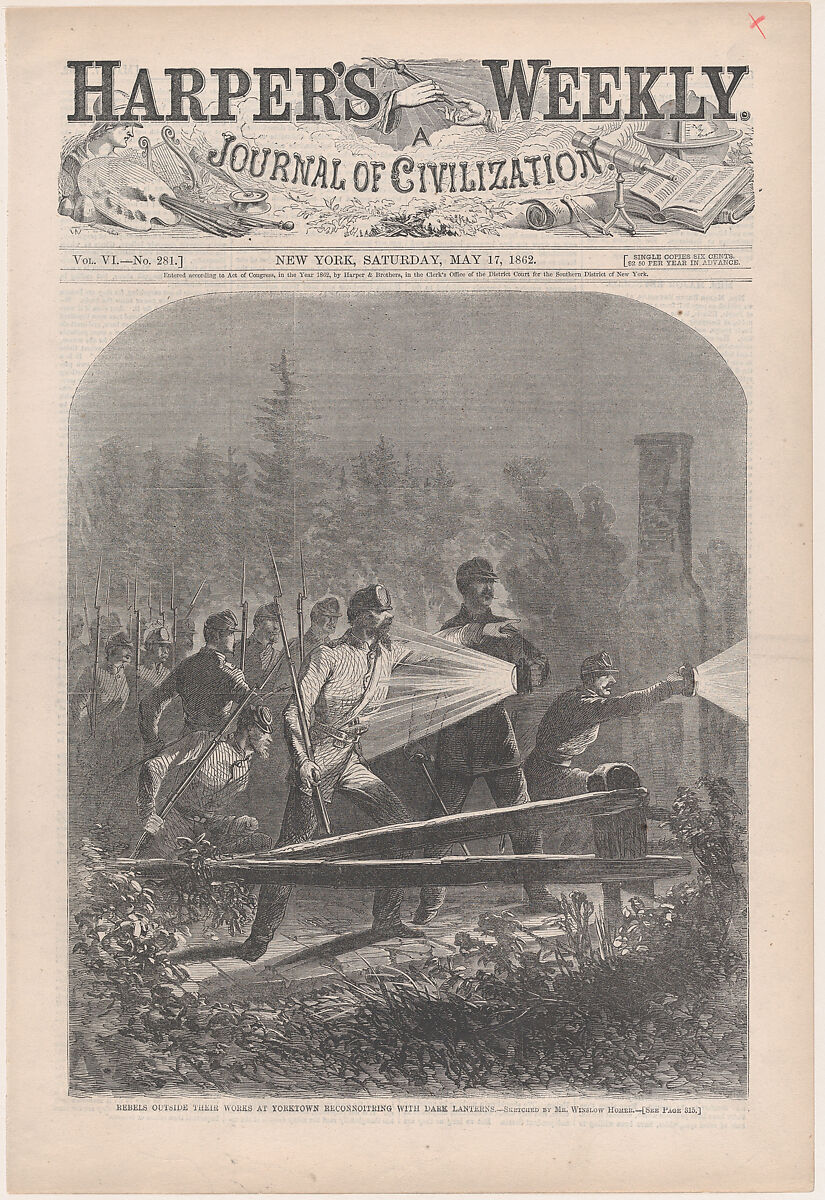 - Title: Rebels Outside Their Works at Yorktown, Reconnoitring [sic] with Dark Lanterns (from "Harper's Weekly," Vol. VI)