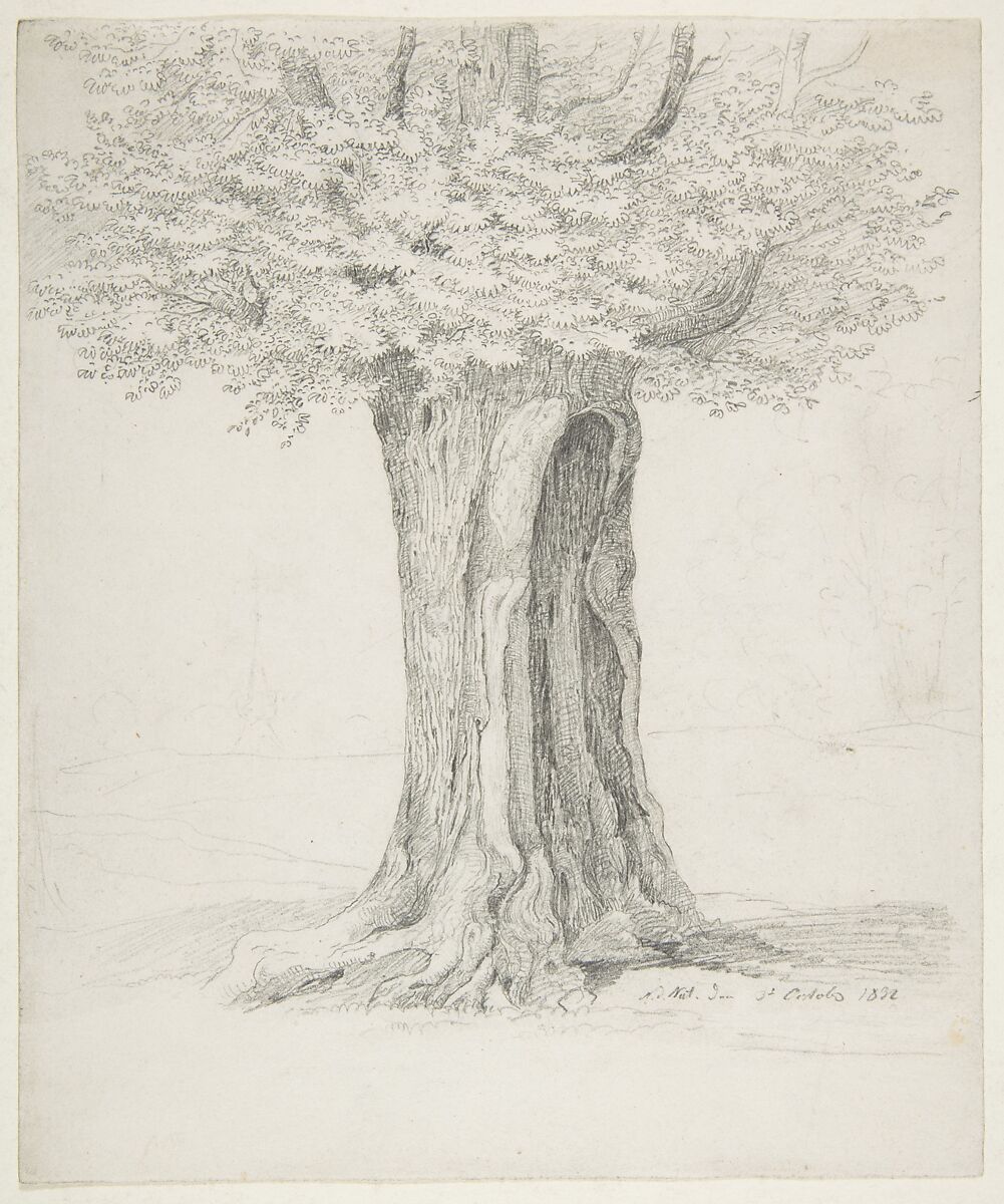 A leading artist of his generation, Oehme here depicts a mighty oak, a tree long associated with German national identity and especially embraced by artists of the Romantic period. As indicated in the inscription, this detailed study of the weathered bark and exposed roots was made from life on October 3, 1832. By focusing on the monumental trunk instead of its towering crown, Oehme created an image of quiet force.