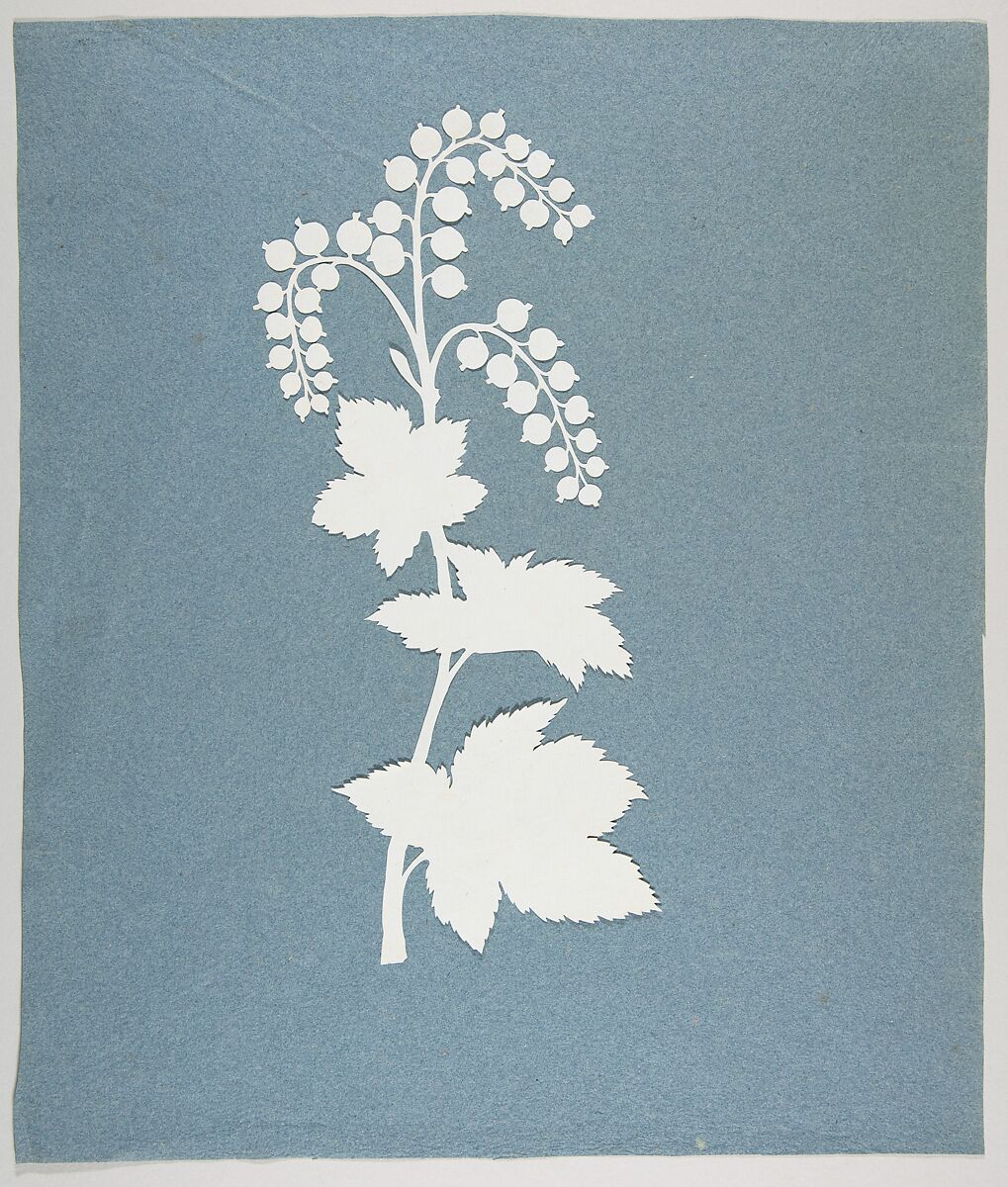 As a child, Runge learned how to cut silhouettes from his mother and sister, a practice he continued throughout his career and one that evolved from standard portrait profiles and small multifigured vignettes to detailed depictions of plant life. In nature, Runge found religious revelation. His process involved careful observation of the peculiarities of a species, which the cut-paper medium necessarily abstracted and idealized, such as in this example of a red currant with its berry-laden stems and feathery-edged leaves. His devotion to the cutout is apparent in his writing; at one point, he goes so far as to claim that his scissors had become an extension of his fingers.