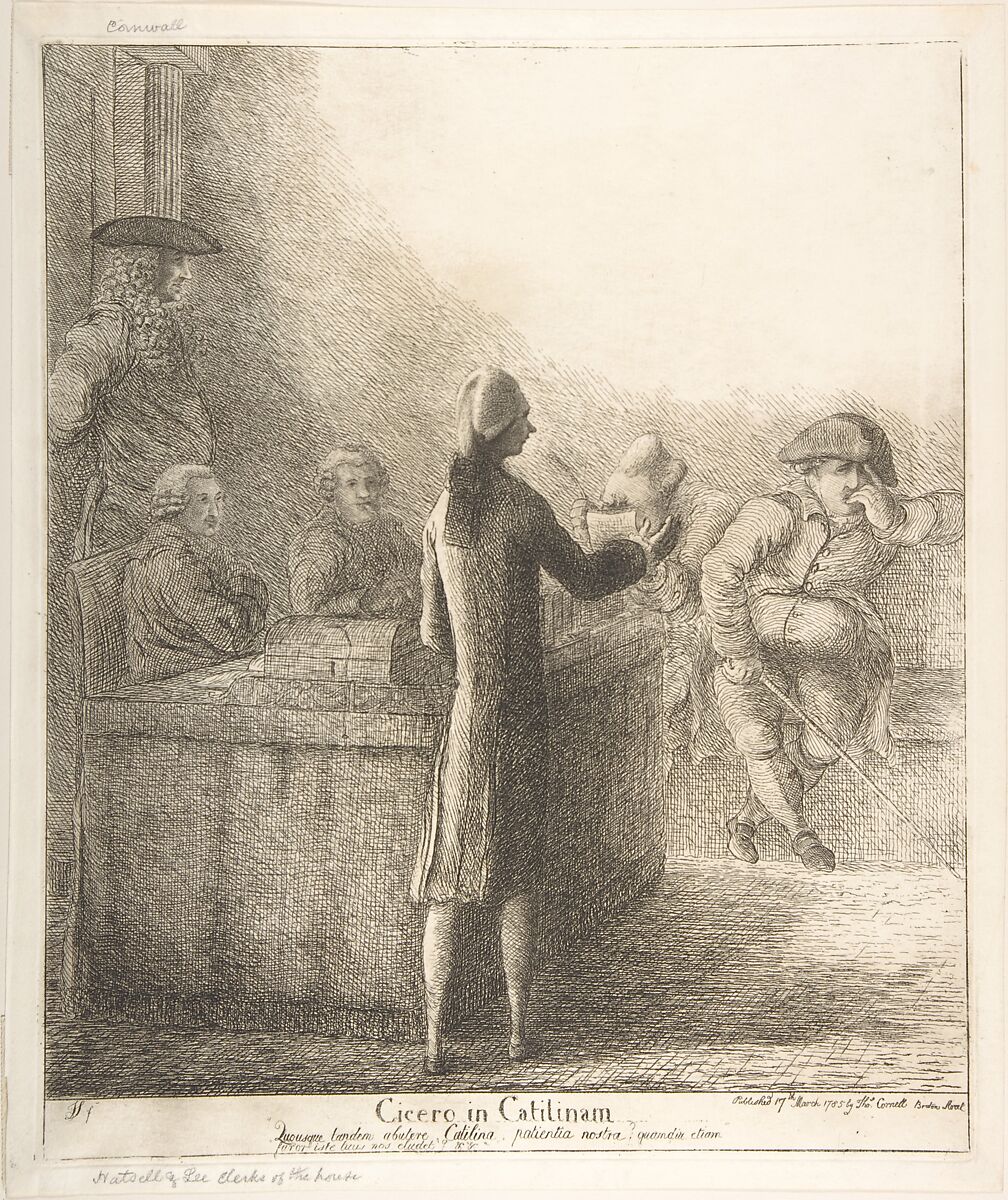 In November 1784, a year after King George III appointed him chief minister, William Pitt faced a general election that secured his claim to office. Here, he stands before the House of Commons, addressing his bitter rivals, Charles James Fox and Frederick Lord North, who squirm with anger at being forced onto Parliament’s Opposition Benches. Fox demonstrates disrespect by wearing his hat and chewing his fingers. North scowls and buries his head in papers. The printmaker expresses his admiration through the title which compares the youthful Pitt to Cicero, a statesman who preserved the Roman Republic by suppressing a coup d’état led by the patrician Catiline. Sayers has brilliantly reduced the complex rivalries driving British politics to a dynamic among three figures. Expressively, densely etched lines set the scene in a half-light suggestive of moral darkness.