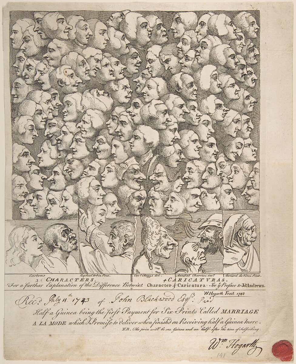 When Hogarth designed this image in 1743, caricature was an Italian mode still little known in Britain. The London printmaker Arthur Pond had begun, in 1736, to issue etchings based on caricatures by Pier Leone Ghezzi, Annibale Carracci, Carlo Maratti, and Guercino, choosing for the most part robustly grotesque examples. Hogarth found Pond's prints distasteful and created "Characters and Caricaturas" to warn against what he saw as a debased foreign form. This first state, which served as a receipt for subscribers to his "Marriage a la Mode" series of engravings (1745), condemns exaggeration and elevates naturalism, the latter begin for Hogarth, a preeminent goal. A panel at the bottom establishes a basic dichotomy: three heads after Raphael, representing an acceptable physiognomic range for character, are contrasted with a row of repellent caricatures derived from Ghezzi, Carracci, and Leonardo. Above, further examples of character are provided by a cloudlike arrangement of profiled male heads in a tiered format resembling caricature drawings by Annibale Carracci. Hogarth's image proved influential in an ironic sense. Rather than dissuading British artists from using caricature, it demonstrated how the genre might be employed with greater subtlety. When later masters such as Rowlandson and Gillray mixed caricature with satire, they generally worked in a range that Hogarth would have called character.