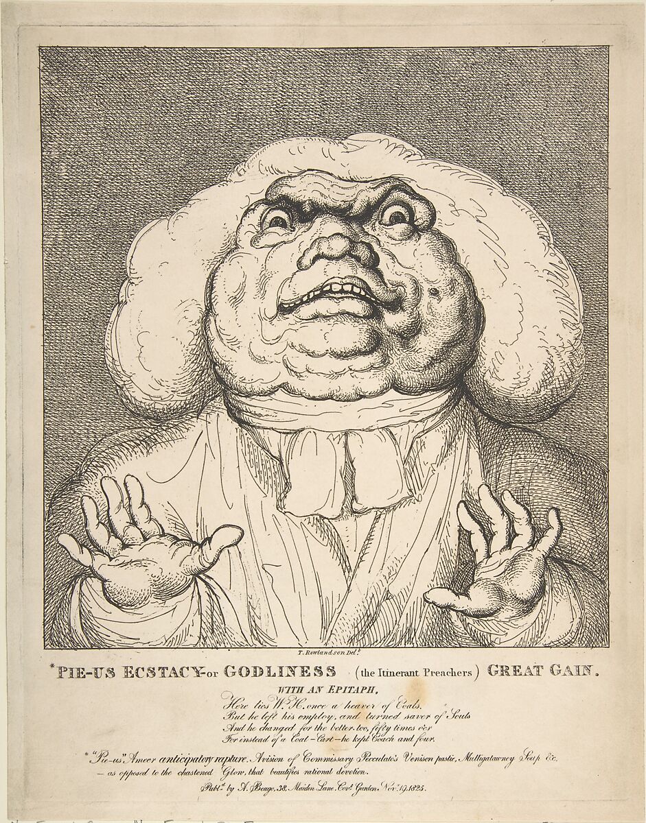 Rowlandson created this grotesque image of greed to condemn false piety. It portrays William Huntington, a wealthy, eccentric Nonconformist preacher who began life as a coal-heaver. He is shown in a state of ecstasy brought on not by a heavenly vision but by thoughts of venison and mulligatawny soup. Verses below parody an epitaph that Huntington wrote in anticipation of his own demise, in which he declared himself to be an unrecognized prophet. Rowlandson’s less complimentary version states: "Here lies W. H. once a heaver of Coals/ but he left his employ, and turned saver of Souls/ And he changed for the better too, fifty times o'er/ For instead of a Coal-cart–he kept Coach and four."