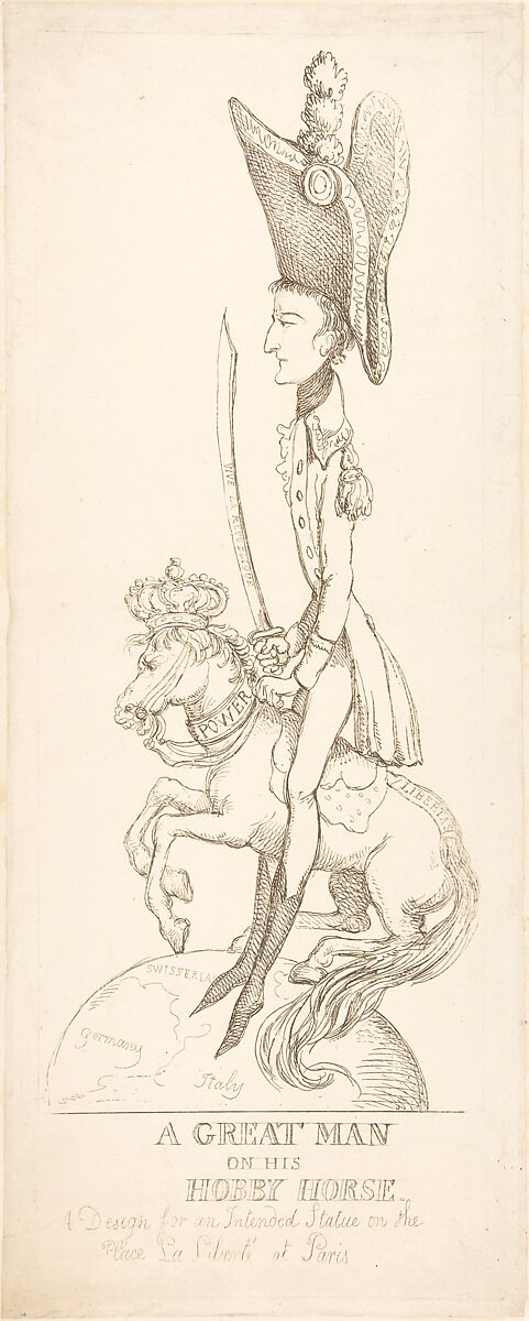 Napoleon, immensely elongated, rides a horse that rears on a globe and wears a crown and a collar lettered "Power." Beneath their feet is a map of Italy, Switzerland and Germany.
