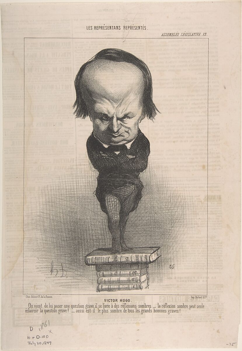 The literary and political lives of Victor Hugo, one of themost frequently portrayed figures of his day, were favorite subjects for caricaturists until his death in 1885. Besides being a well-known author, Hugo was also a politician. He began as a conservative, but his increasingly liberal republican views eventually forced him into a period of exile. This print, from a series of 109 images of legislators by Daumier called "Les Représentans Représentés" (The Representatives Represented), was made just after Hugo was elected to the Legislative Assembly. Already famous for his writing at that point, he stands on a large stack of books. The inscription translates as "He has just been posed a grave question, he gives himself over to somber reflections -Somber reflection can only illuminate the grave question! - And so isn't he the most somber of all great grave men!" Created in a period of strict censorship laws, imposed in 1835, the portraits and accompanying inscriptions in "Les Représentans Représentés" are much more genial than those in the artist's earlier renderings of political figures. Les Célébrités de "La Caricature". Daumier drew the later series in a style of caricature that was becoming popular around this time, in which the subject's large head sits on a small body.