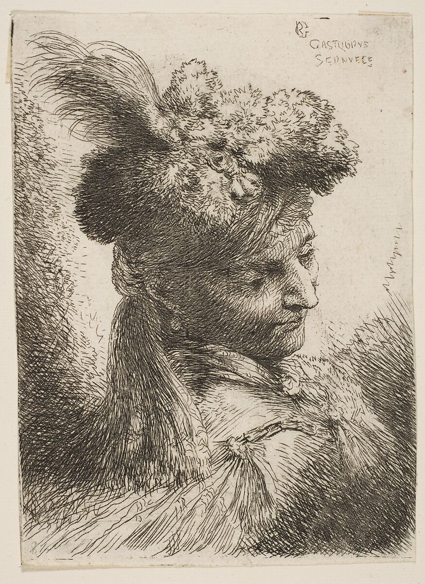 Young man facing three quaters right wearing a fur headdress with a plume, jewel and a headband, from "Small Heads in Oriental Headdress"