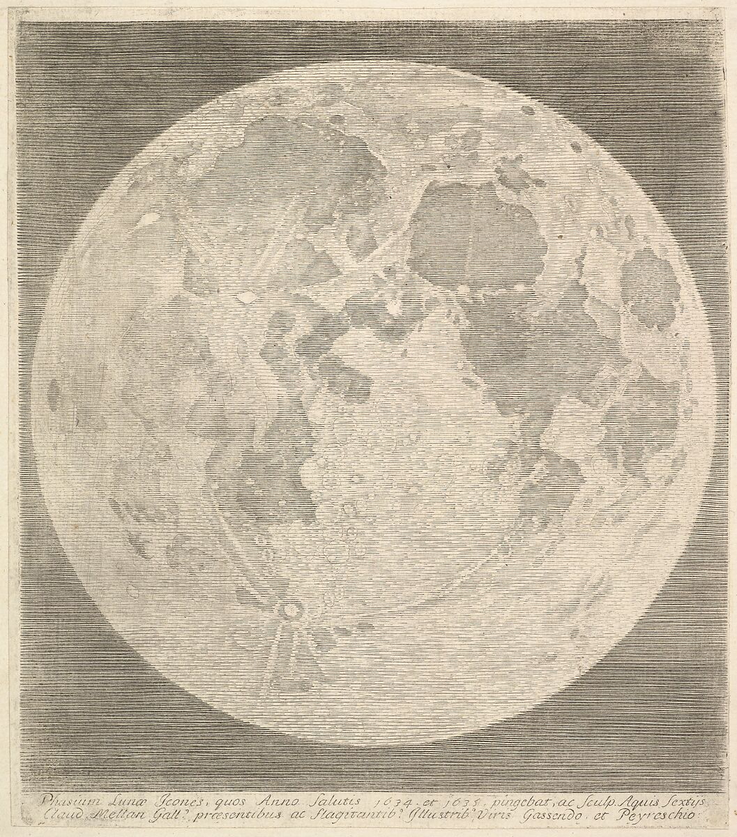 This modern-looking engraving is one of three remarkable prints by Mellan that depict the phases of the moon after sketches he made in Aix-en-Provence in early 1636. Mellan drew what he observed through a telescope, a Dutch invention from about 1608. The engravings were commissioned by Nicolas-Claude Fabri de Peiresc, a French humanist, and Pierre Gassendi, a theologian with a passionate interest in astronomy. Mellan completed the prints upon his return to Paris in May 1637. Peiresc, who died in June of that year, never saw the finished works.
