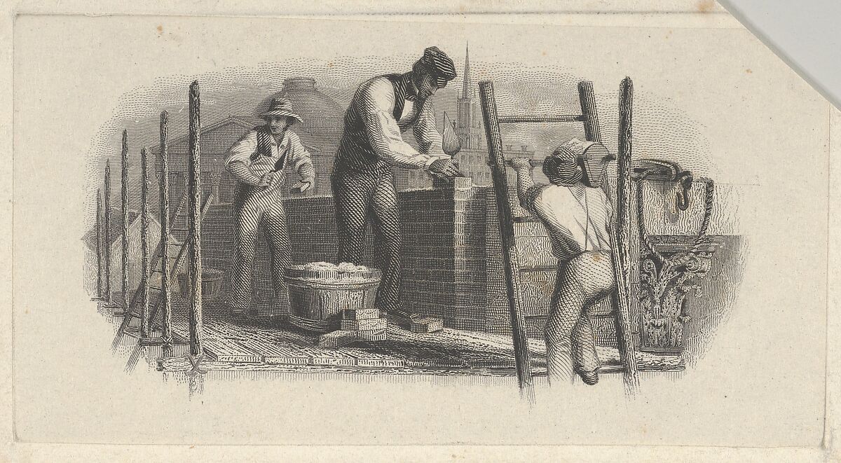 Banknote vignette showing three men on a scaffold laying a brick wall