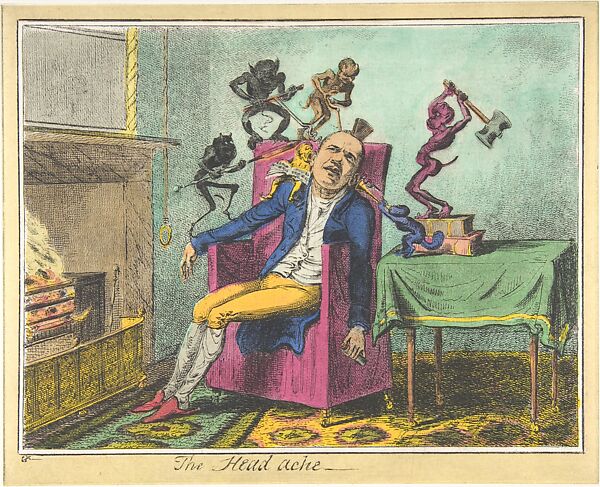 In The Head Ache, President Barack Obama is assaulted by little devils who hammer and drill at his head and blow a trumpet in his ear. Chagoya based this humorous take on the president's tribulations in passing a plan to reform the nation's health care system on an 1819 etching by Cruikshank with the same title. The earlier Head Ache, paired with a print entitled The Cholic, was a straightforward depiction of a suffering man grasping a useless bottle of medicine. Here, the devils can be seen as the conservative media and Republican politicians who launched an assault against the president and his proposal. As he had done previously with etchings by Goya, Chagoya appropriated a print from the past to make a contemporary political statement. In a complex process that involved collaboration with three print shops and the Rosenbach Museum and Library in Philadelphia, Chagoya digitally reproduced the original but replaced the man's head in the British print with a drawn portrait of the president, which was then added by digital means to the etching plate.