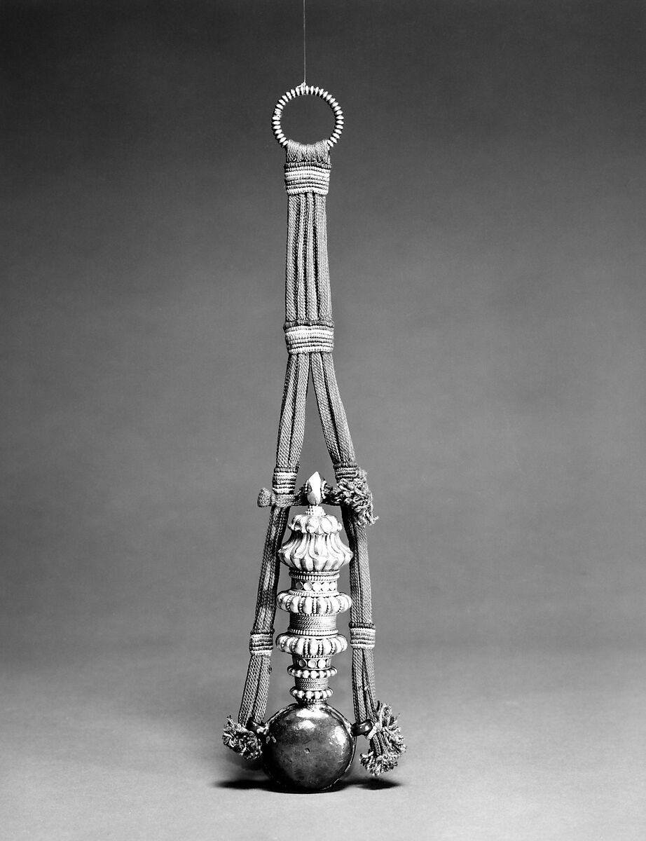 - Medium: Bottle: silver gilt with copper; case: silk, metallic thread