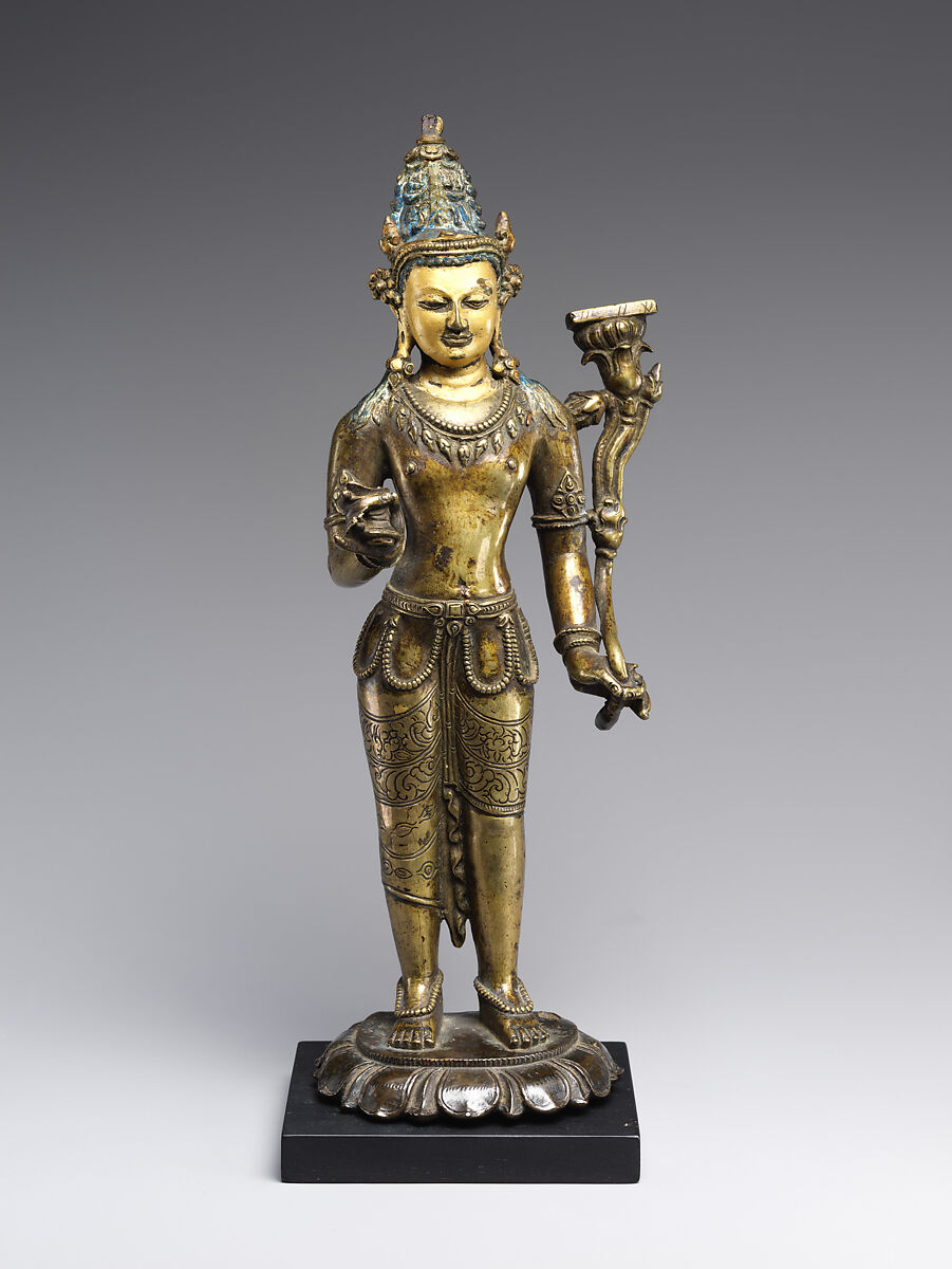 Manjushri and his counterpart, Prajnaparamita, the wisdom goddess, are understood as personifications of awakened knowledge. Both display the palm-leaf manuscript (pustaka) embodying wisdom as their principal identifier, here seen atop the lotus bloom. Manjushri wields a sword as his other attribute, symbolizing the cutting away of all impediments to enlightenment. Here the blade is missing, but the hilt is visible in the projecting hand. He wears a skirt-cloth decorated with registers of flowers secured with a belt from which strings of pearls hang is loops.