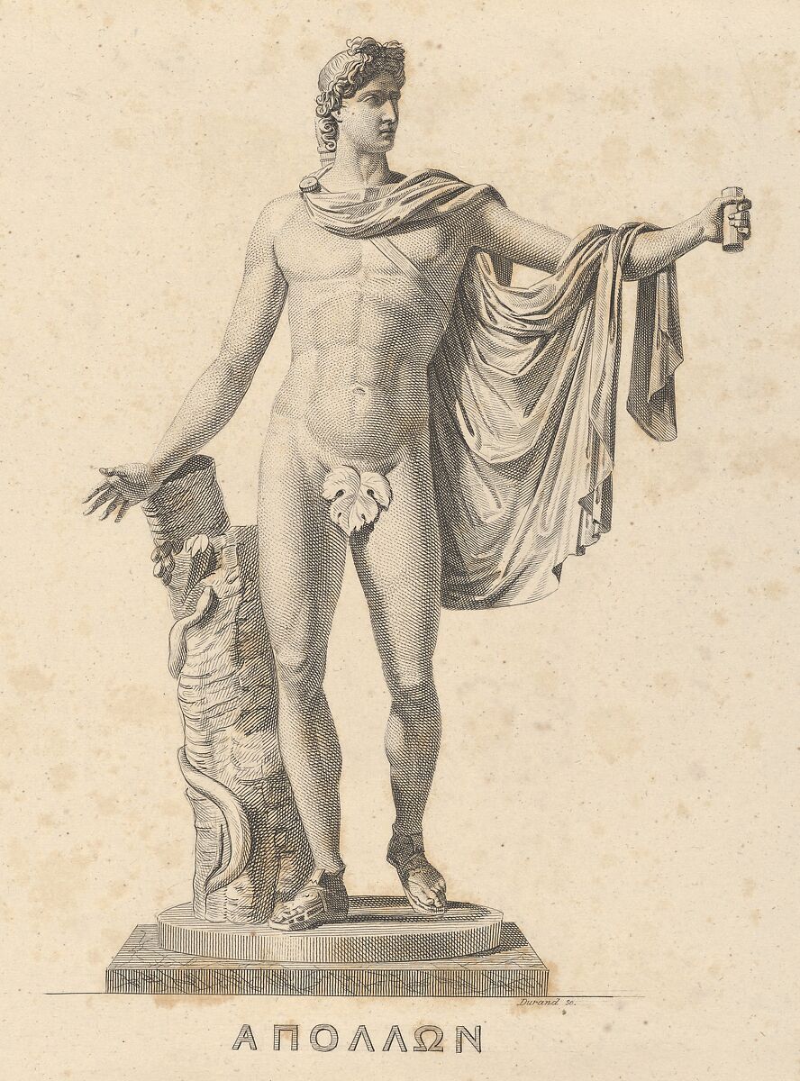 This image of the Apollo Belvedere, a famous antique sculpture preserved in the Belvedere Courtyard at the Vatican, was engraved to ornament the printed record of an address Robert Ray delivered to the American Academy of Fine Arts in New York on November 17, 1825.