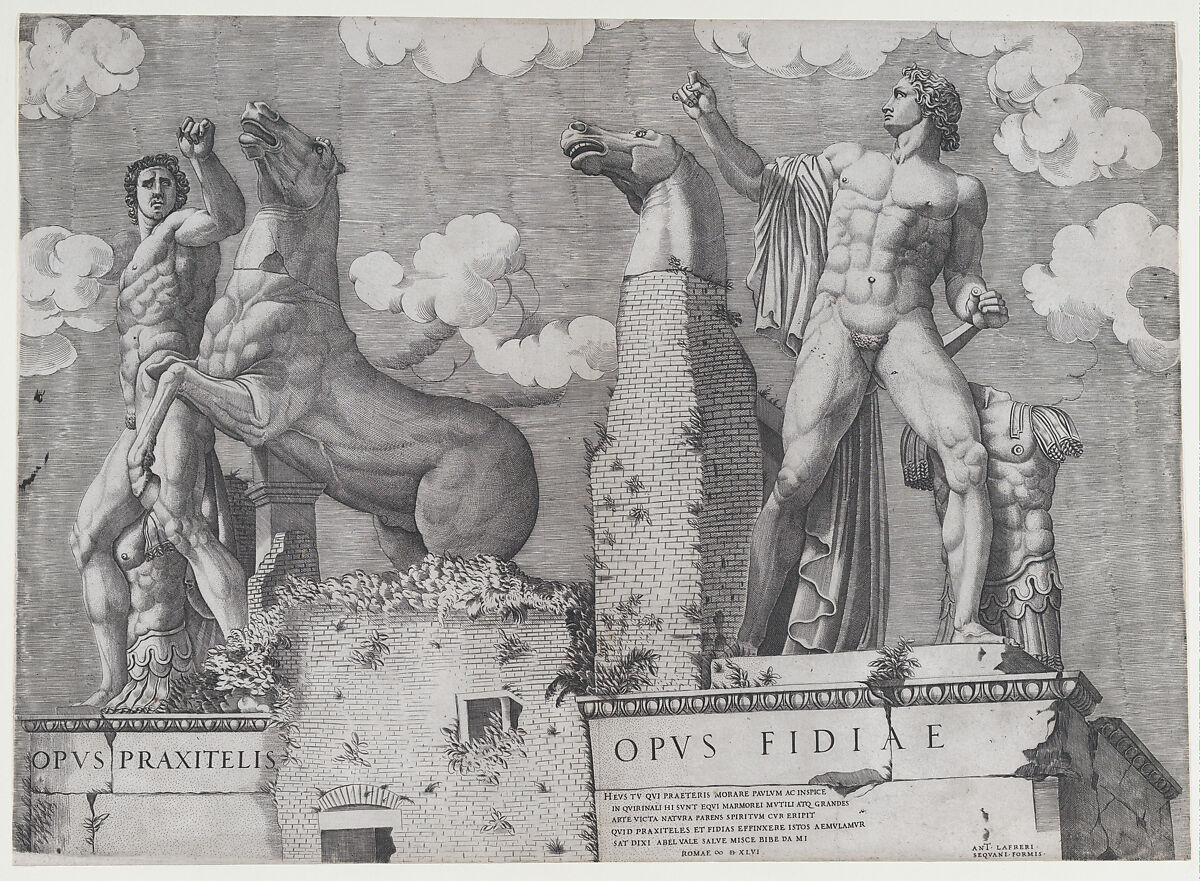 The giant sculptures of the Dioscuri, as the twin brothers Castor and Pollux are known, have stood on the Quirinal Hill in Rome since antiquity. This engraving provides one of the few illustrations of their dilapidated condition during the Renaissance, before they were restored between 1589 and 1591 under the direction of Pope Sixtus V (r. 1585-90). Domenico Fontana's (1543-1607) new design for the sculptural group included installing a fountain, reorienting the direction of the figures, and placing them on pedestals. Two centuries later, during the pontificate of Pius VI (r. 1775-99), their positions were adjusted once again, and an obelisk from the Mausoleum of Augustus was placed between them, which conforms to the arrangement we see today.