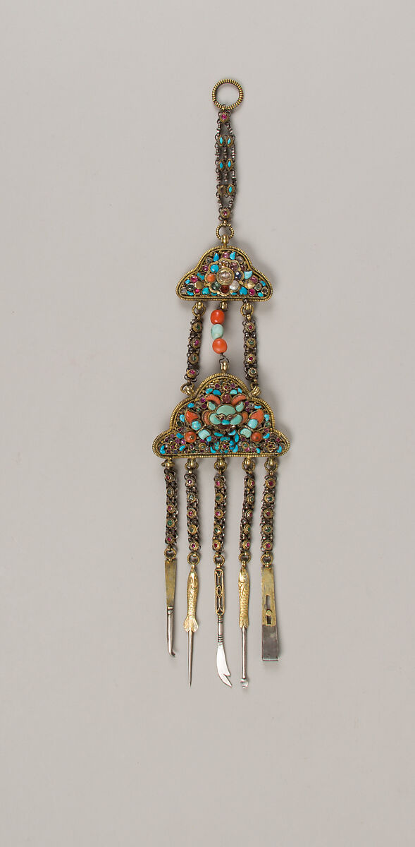 Personal grooming tools were integrated into the elaborate ensemble of jewelry worn by women on important occasions. Dangling below this pair of belt hangings are nail clippers, an ear pick, a nail cleaner, a pin, and tweezers.
