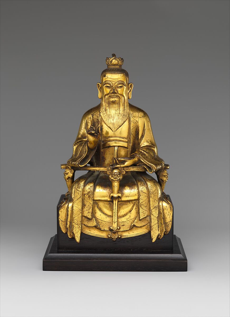Identified by his full beard, Laozi is the quasi-historical author of the seminal Daoist text Dao de jing (The Way and Its Power). In addition to its sumptuous gilding and sensitive presentation, this sculpture is remarkable for its long inscription on the underside of the pendant robe indicating that it was commissioned by an official from a northwestern frontier city for his mother in the Ming capital, Nanjing.