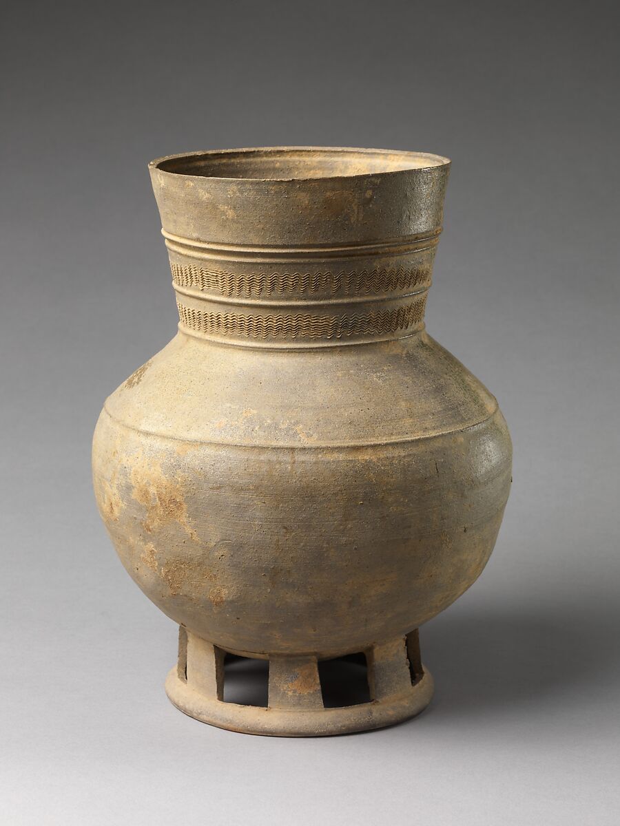 Vessels of this type—featuring a long neck with an incised wave design and a bulbous body on a perforated foot—have been unearthed at various Silla sites. This example is representative of those found in the capital city of Gyeongju.