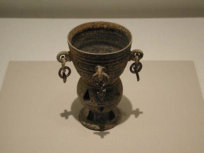 The hollow base of this cup contains small clay pellets that produce a pleasant sound when the user tips the cup. Such luxury items, mostly excavated from tombs, were probably used by the occupant in daily life.