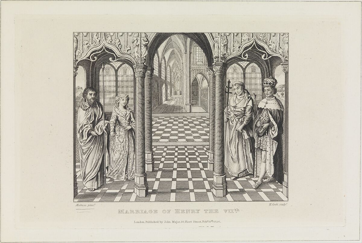 In the interior of a church, King Henry VII of England stands with a cleric at right, opposite his bride, Elizabeth of York, who stands with a male attendant at left. The print was created as an illustration to Walpole's Anecdotes of Painting in England, with additions by the Rev James Dallaway (London: 1826), Vol 1. p. 94.